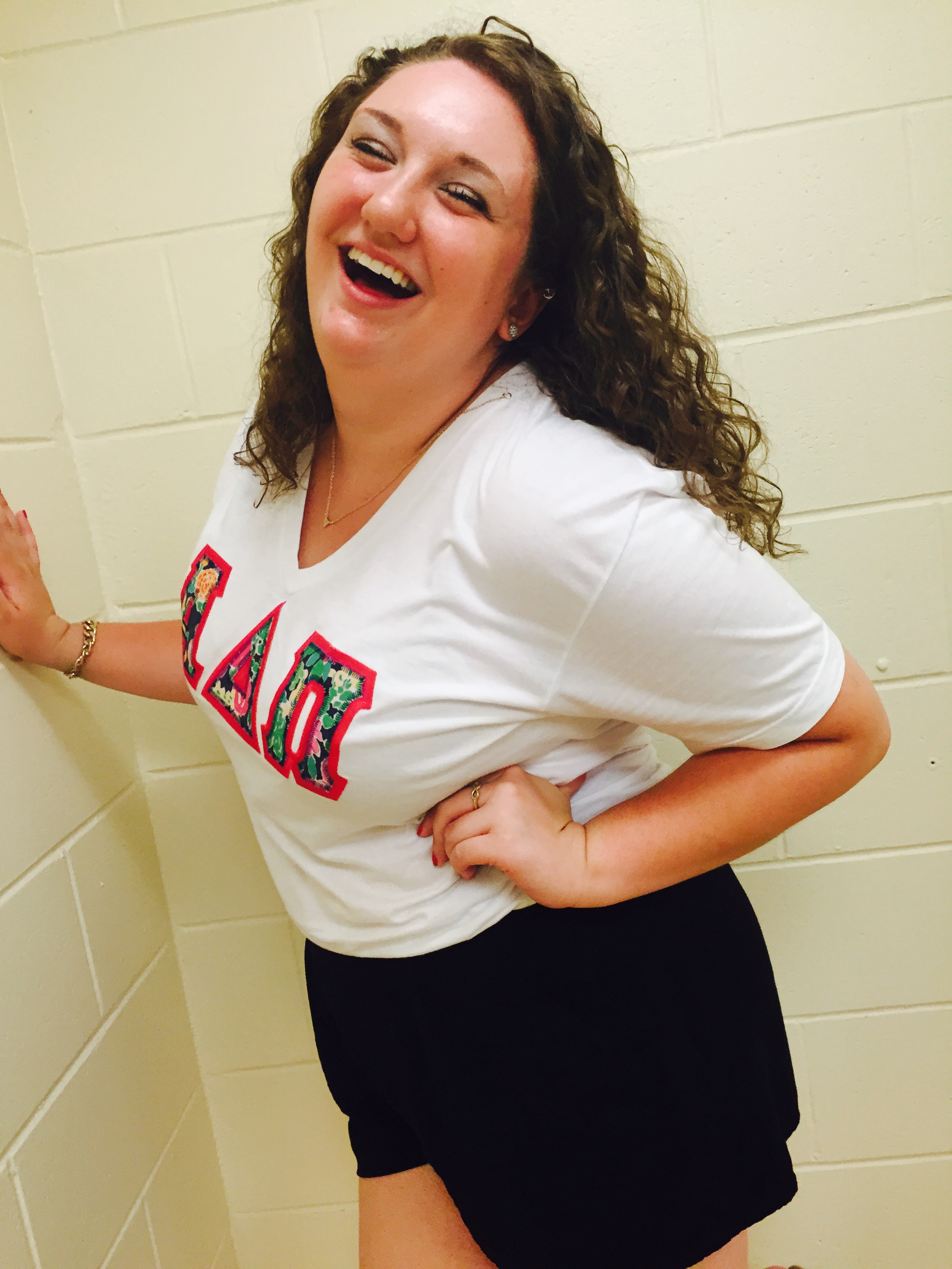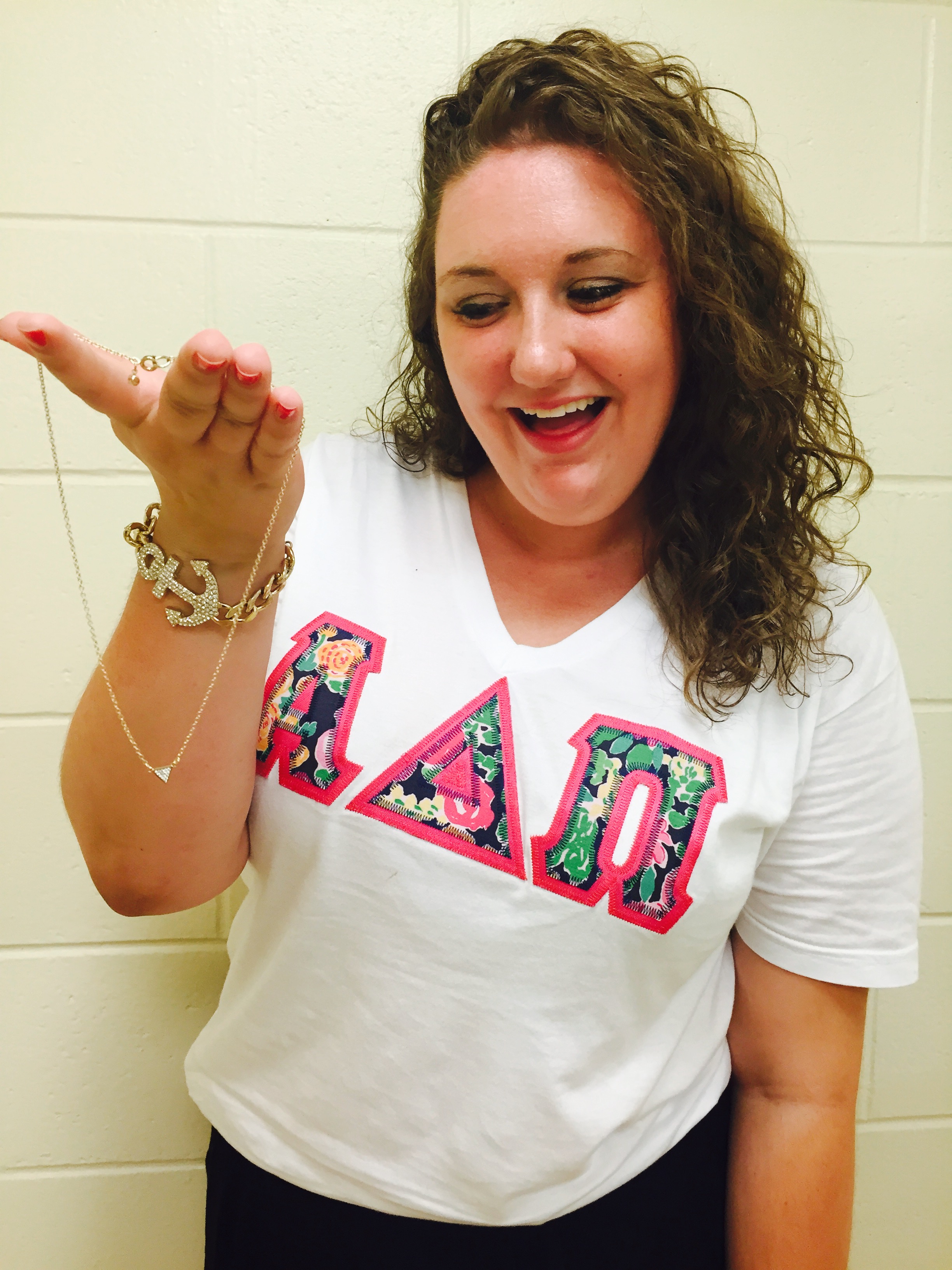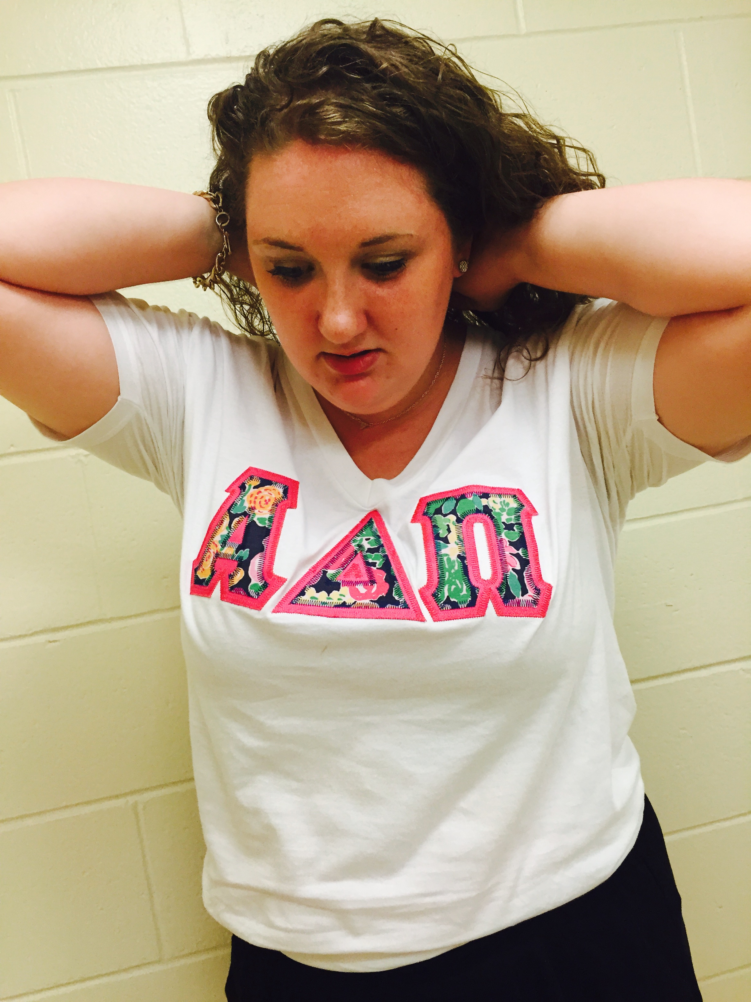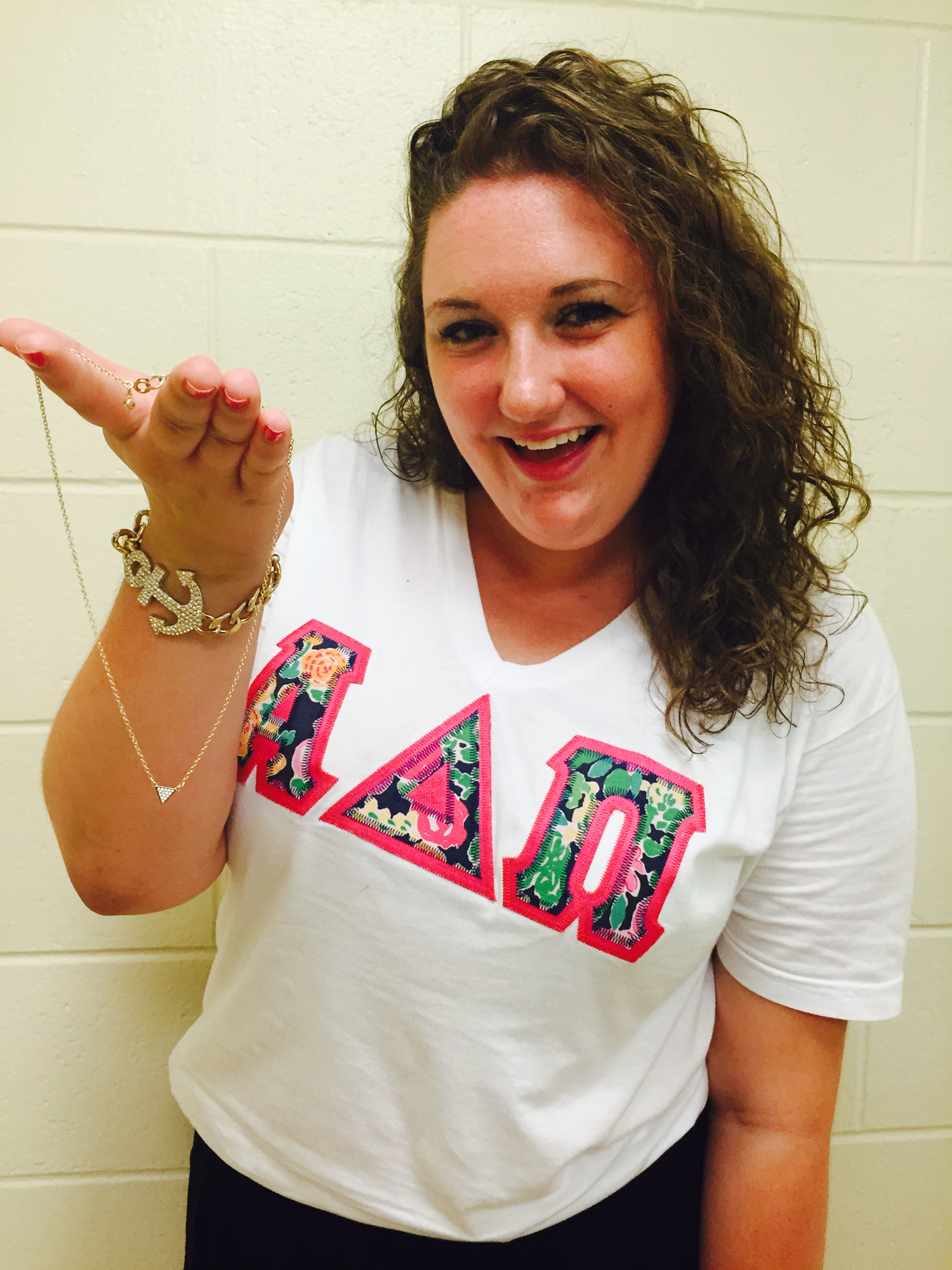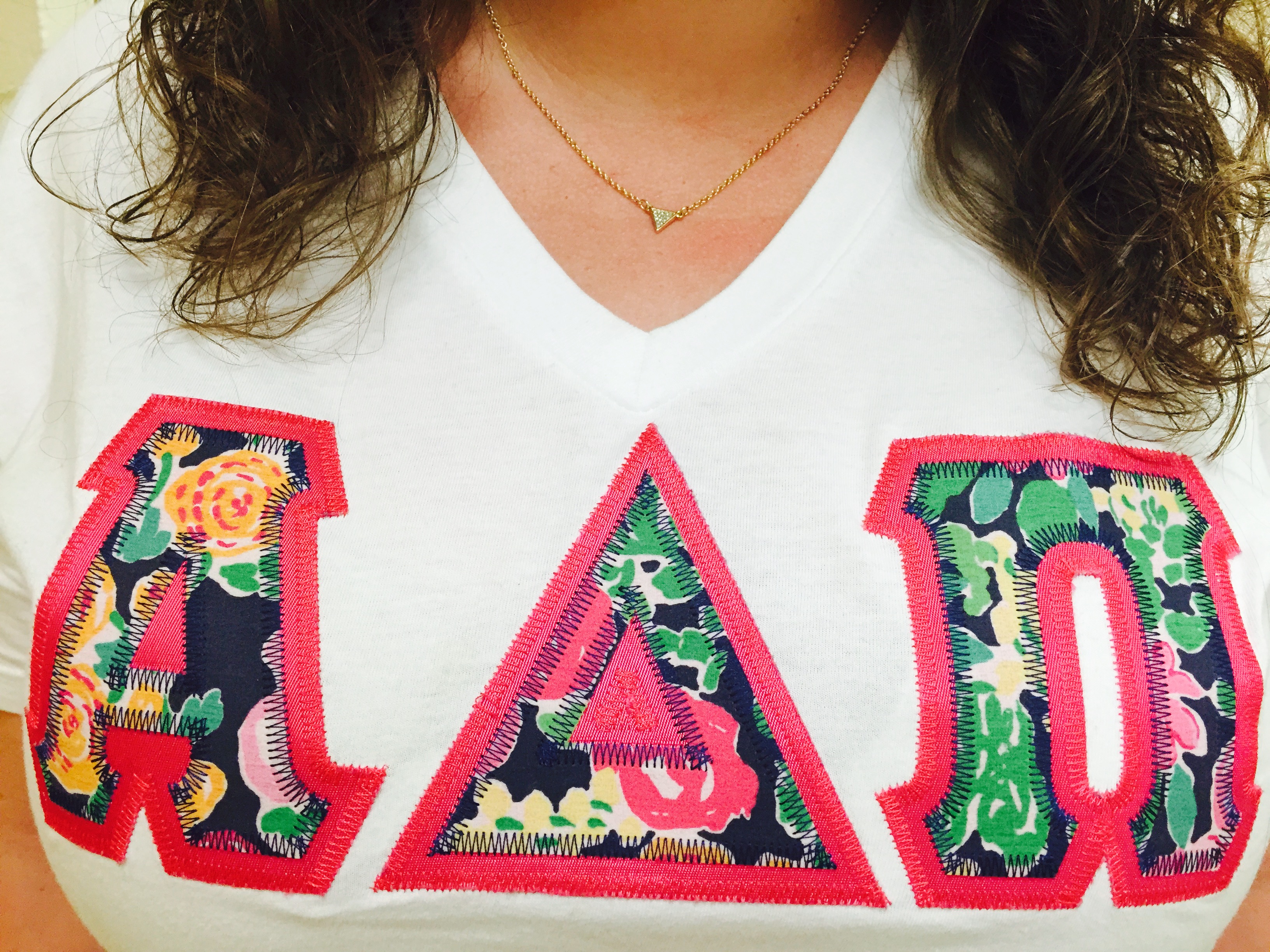 Since recruitment is this week, I have been wearing letters everyday this week and showing off the campus how proud I am to be an Alpha Delta Pi. When wearing my Sophie Harper necklace, I wore my family letters made by Jenna Benna & Co. in Lilly Pulitzer‘s Getaway Garden pattern. Jenna Benna & Co. makes customized sorority apparel and is always my go-to for letters, especially Lilly print ones!